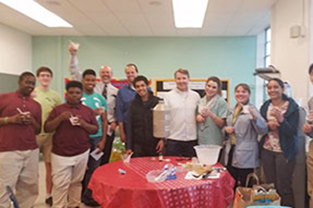 Saturday afternoon began with a graduate student panel, in which the SPS students and graduate students in different physics fields held vivid discussions about their experiences applying for graduate school, taking graduate level classes and doing research. This was followed by a physics-related treasure hunt on the GW campus, and several demonstrations of fun physics experiments by many of the students. The outreach demonstrations included a vacuum gun with ping pong balls, which crushed soda cans to dramatic effect; simulating supernova explosions with bouncing disks; predicting the rolling speed of differently shaped objects; playing with non-Newtonian fluids, leaving some of the faculty covered in cornstarch; and making and eating liquid nitrogen ice cream.