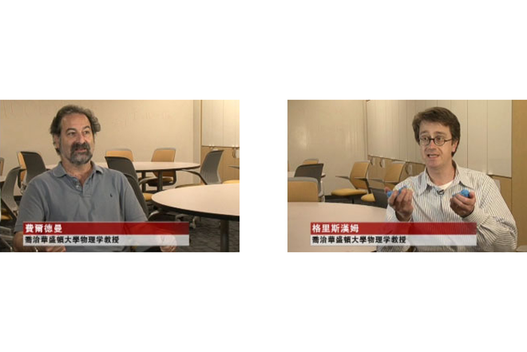 Have you ever wondered what your name and affiliation might look like written in Mandarin? Professors Gerald Feldman (Nuclear Experiment) and Harald W. Griesshammer (Nuclear Theory) know. They recently appeared on Voice of America China, a U.S. funded Mandarin-language TV station.