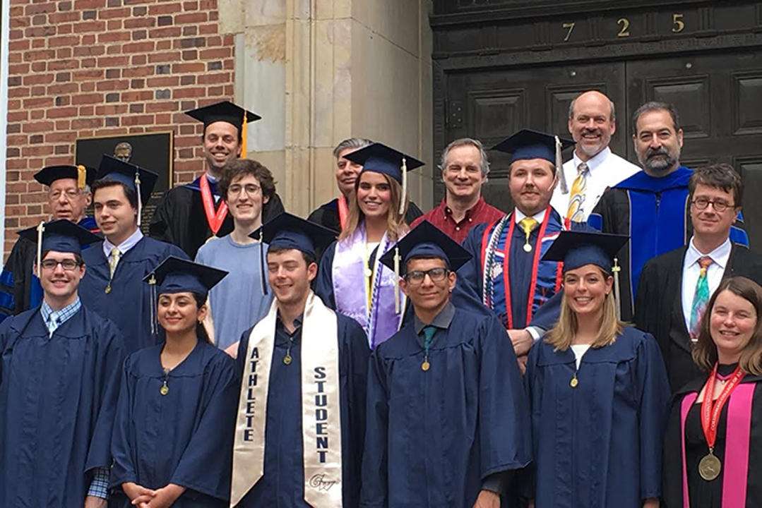 At the end of the award presentation, all the graduating students received two gifts that will remind them of their time at GW for years or decades to come: a GW Department of Physics mug and a wooden pyramid puzzle, similar to the one they all used to entertain themselves at the physics front office. After donning the robes, the faculty and students participating in the Columbian College celebration had a photo shoot on the Corcoran building steps.