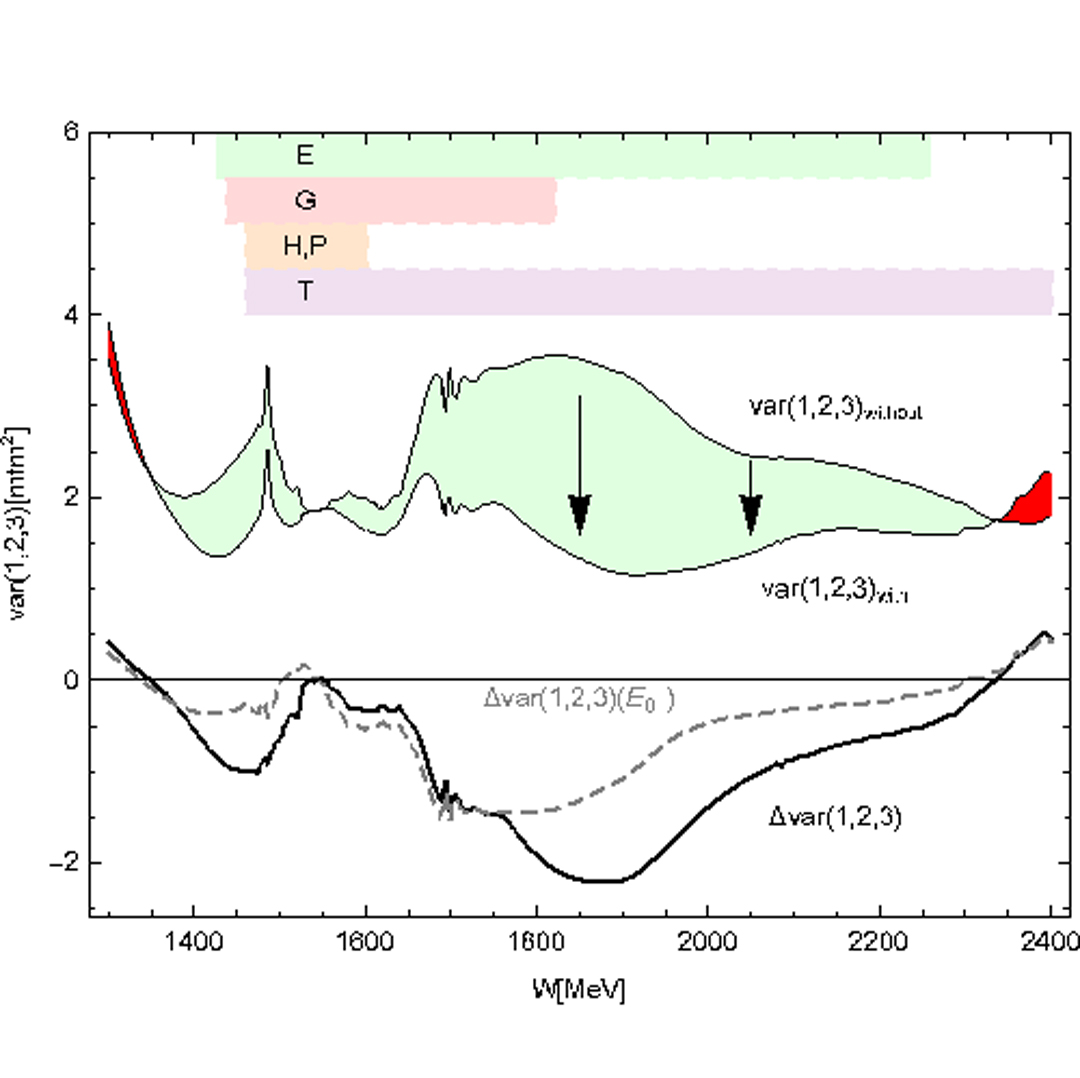 The figure shows the decrease in variances among the solutions of different analysis groups (GW-based SAID and JuBo groups together with the BnGa group from Bonn) once new data are included. The decrease, indicated by the arrows, is shown as a function of the energy W. This demonstrates the significant impact of new high-precision data from Jefferson Lab (Newport News) and Mainz/Bonn (Germany). See text for further description. Source: Eur. Phys. J. A52, 284 (2016).