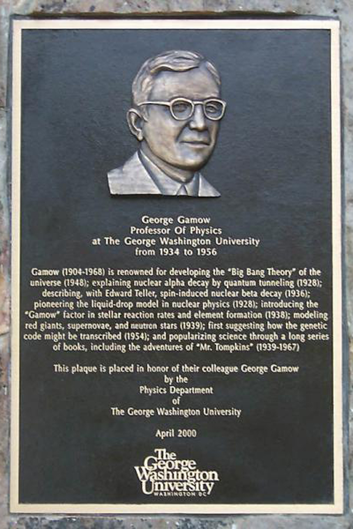 Plaque dedicated to George Gamow that is mounted in front of Samson Hall where Gamow had his office, now numbered 308.