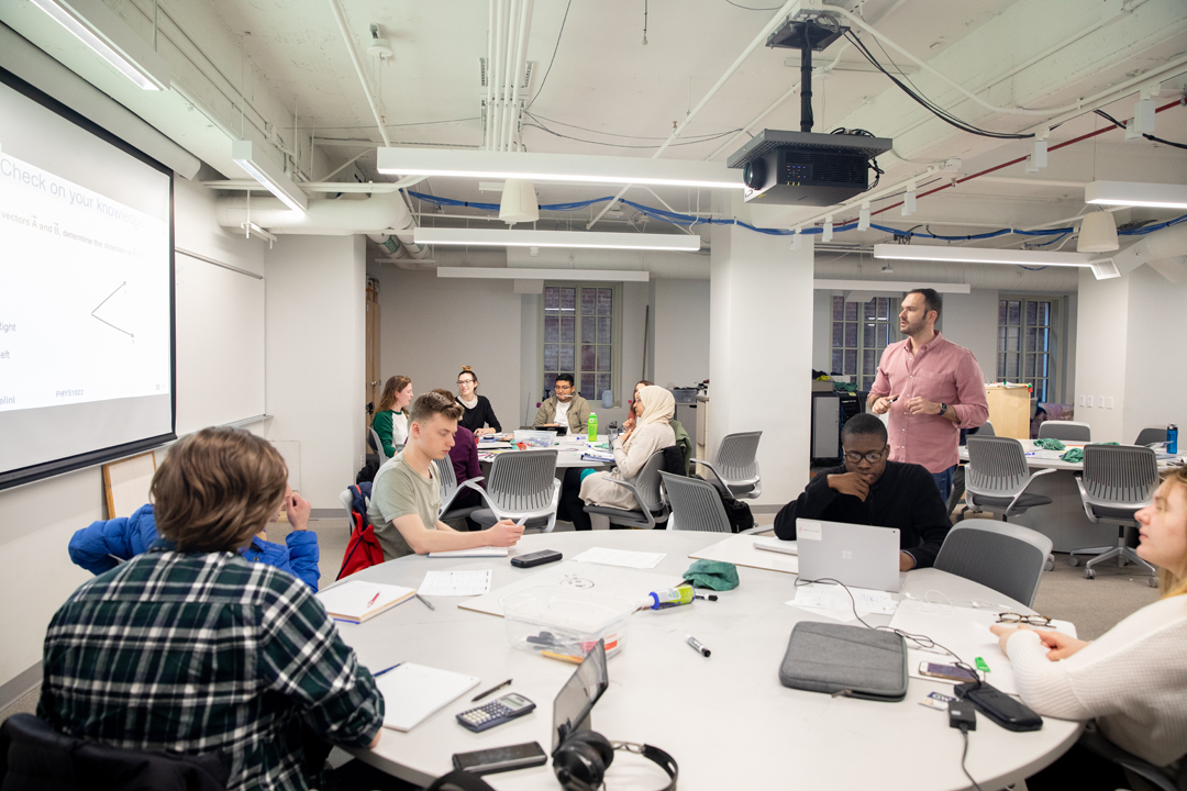 The Student-Centered Active Learning Environment for Undergraduate Programs — otherwise known as “SCALE-UP”— is an active learning environment designed to promote hands-on education in a group setting. Physics students work in groups and use audio-visual tools, LCDs, whiteboards and interactive clicker technology to give and receive real-time feedback during class. A ceiling camera allows instructors to project a document or textbook onto the screen, and students can use video inputs to present through the classroom projection system from their own devices at each desk. The collaborative setting empowers students to discuss their work and engage in an active learning environment. The SCALE-UP classrooms are located in Corcoran Hall on Foggy Bottom Campus.