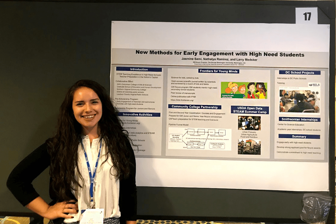 Every year, the Physics Department has many undergraduate and some graduate students presenting posters at the CCAS Research Showcase, which is usually held in mid April. During this great event that showcases research from students across the Columbian College of Arts & Sciences, the Physics Department is always well presented by seniors in Physics, Biophysics and Astronomy & Astrophysics, and some juniors in these majors, as well as graduate students representing the various research areas in the department. Presenting seniors are well prepared for this event as part of the Physics Symposium (PHYS 4200) course, and presenting juniors can put their writing and presentation skills they learned in Intermediate Lab I (PHYS 2151W) and Physis Capstone (PHYS 4195W) into practice. Many students and faculty visit the Research Showcase to learn about all the great research activities and support the presenters.